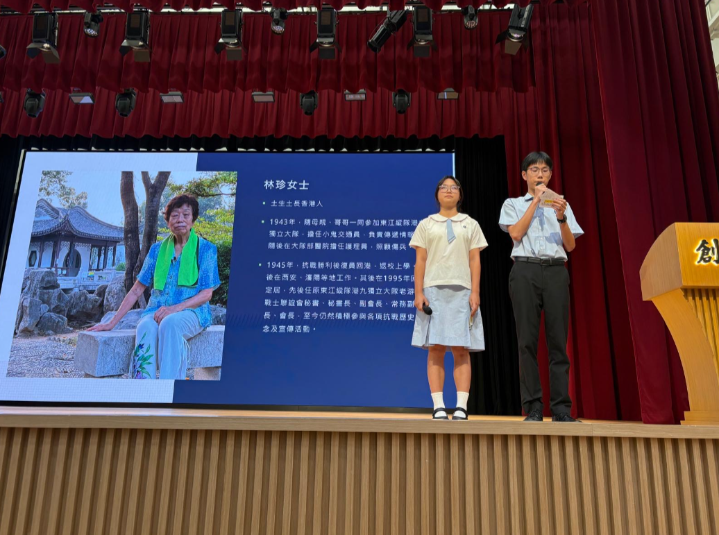 On the afternoon of October 20, F.5 students of Chinese History group from our school attended the "Remembering History, Creating the Future: A Lecture on the 80th Anniversary of the Victory of the War of Resistance Against Japanese Aggression" sponsored by the Principals' Association of Kowloon City Secondary School and undertaken by Scientia Secondary School. Lin Zhen, former president of the Association of Veteran Guerrilla Fighters of the Hong Kong-Kowloon Independent Brigade of the East River Column, explained the deeds of the Hong Kong-Kowloon Independent Brigade and shared her valuable experience to more than 700 teachers and students of more than 10 secondary schools in the district. She emphasized that the victory of the Anti-Japanese War belongs to the people, and hoped that students would remain true to their original aspirations, keep history in mind, take responsibility bravely, and create the future.