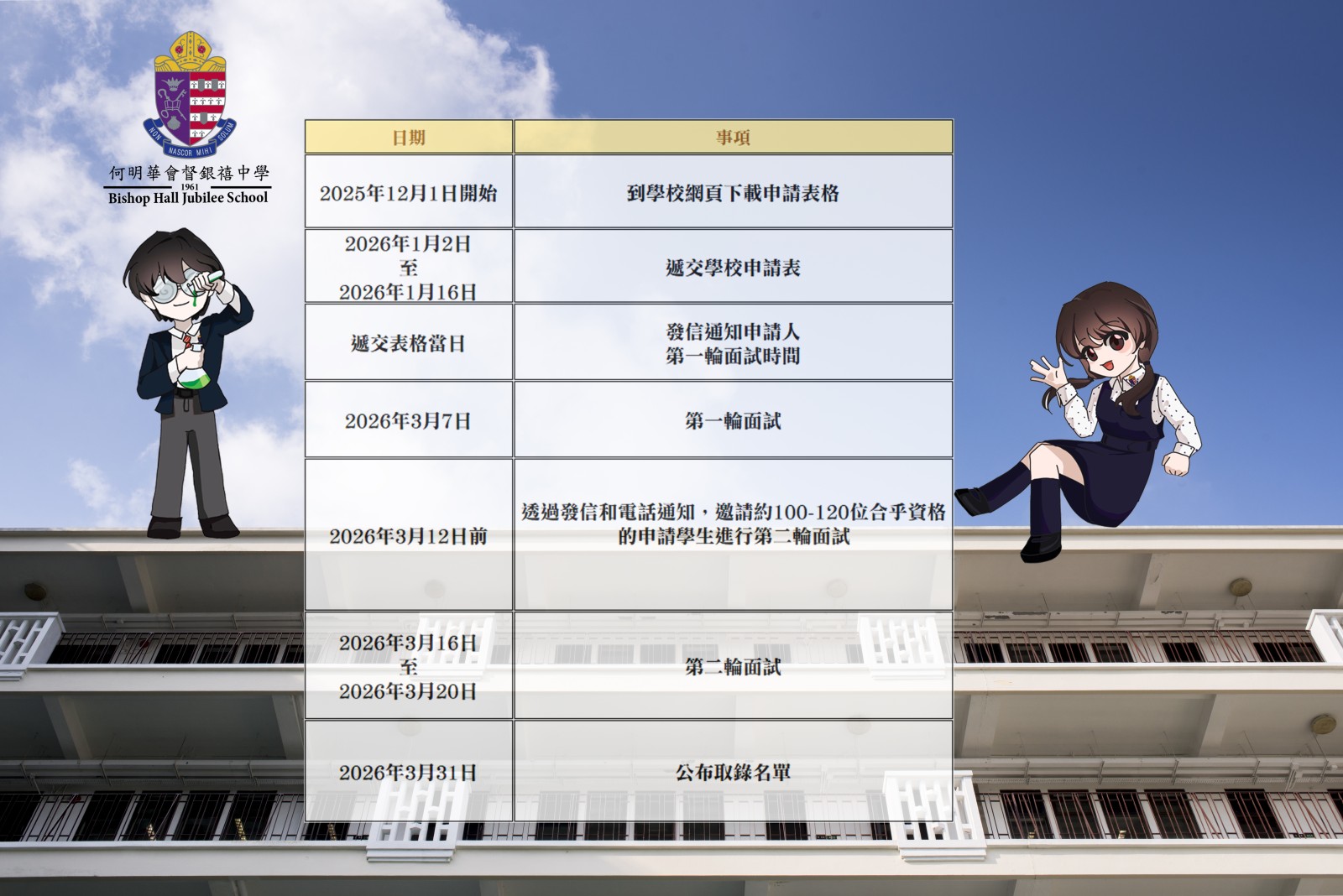 1. #所有合資格的申請人將獲邀於2026年3月7日進行第一次面試。面試將以個人形式進行,考生須以粵語及英語應試。面試主要考核學生各方面的能力,包括:學生中、英文能力、理解能力及表達能力等。詳情將列於面試邀請信。